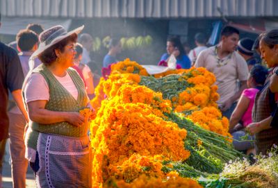 Lors du Jour des morts, ce marché devient un endroit central où les familles viennent acheter des fleurs de coucou mexicaines et des bouquets spécialement arrangés pour décorer les autels traditionnels en hommage à leurs proches disparus.