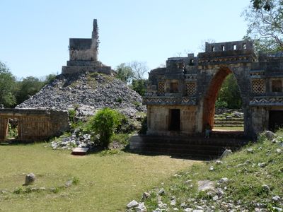 Labná est un site archéologique avec plusieurs structures de pierre décorées de masques taillés et de motifs géométriques dans le style architectural Puuc. Le complexe palatial, les tours et l'arche cérémonielle occupent deux cours reliées par des chemins en pierre.