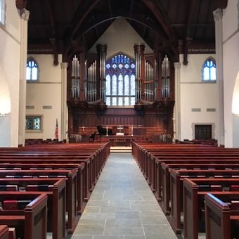 L'Église Méthodiste Unie de Highland Park présente une architecture néogothique avec des arcs pointus, de la maçonnerie en pierre et des vitraux.