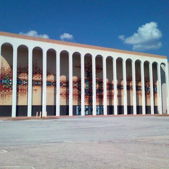 Le bâtiment affichait la plus grande mosaïque de verre sur une surface unique aux États-Unis, mesurant 180 mètres sur 110 mètres.