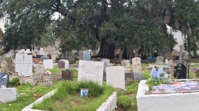 Holt Cemetery est un cimetière avec des sépultures en terre situé à côté du Delgado Community College. Les tombes affichent un mélange de marqueurs faits à la main et commerciaux sur le terrain.