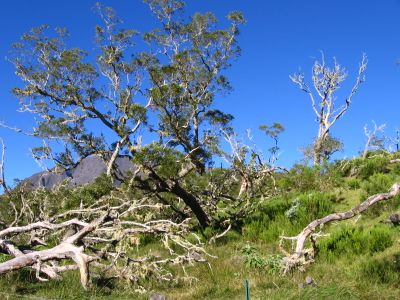 Le sol forestier présente de nombreux arbres tombés recouverts de mousse, tandis que la brume enveloppe fréquemment les spécimens d'Acacia heterophylla.