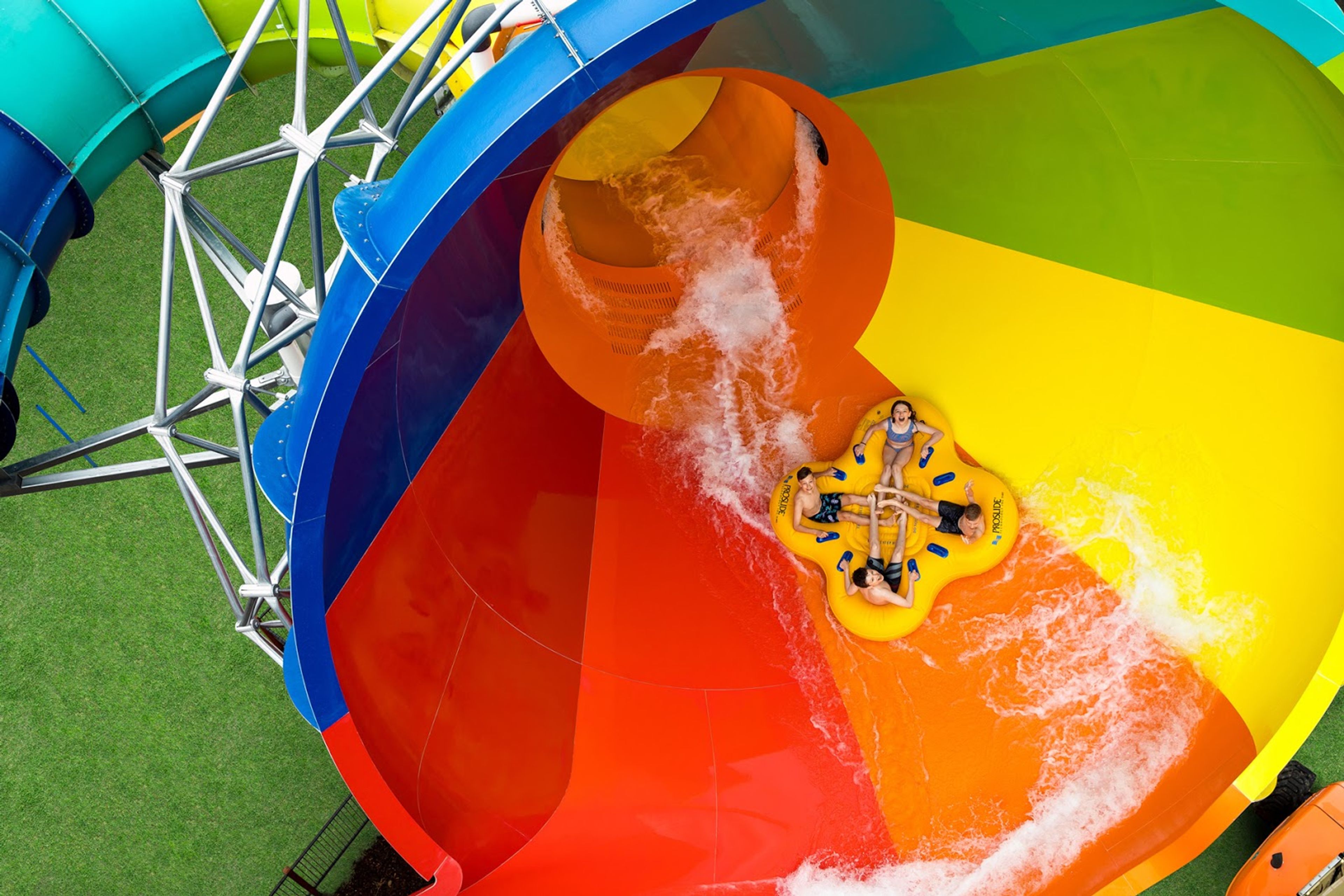 Le toboggan Wild West Canyon effectue deux rotations complètes de 360 degrés dans un tunnel sombre, créant une expérience aquatique intense.