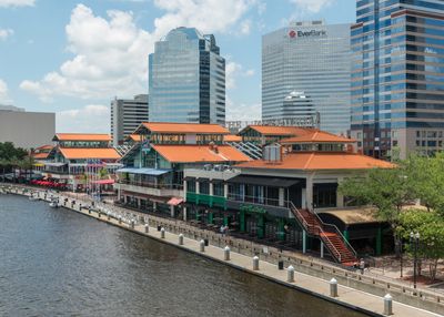 Le complexe vitré de deux niveaux s'étend le long de la rive nord du fleuve St. Johns avec des espaces commerciaux et des vues sur l'eau.