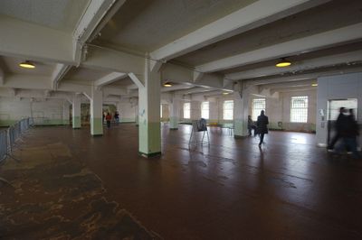 Le réfectoire d'Alcatraz est une grande salle sur l'île de la prison avec de longues tables disposées en rangées sous de hauts plafonds et un éclairage de style industriel. Les chaises en métal et les fenêtres le long des murs donnaient à l'espace une apparence austère et utilitaire conçue pour servir les besoins de nourrir des centaines de personnes efficacement.