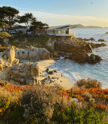 La Maison Papillon présente un toit en forme d'ailes et se trouve directement sur le littoral rocheux de la baie de Carmel, offrant des vues de Point Lobos à Pebble Beach.