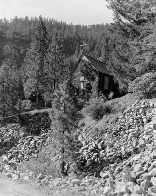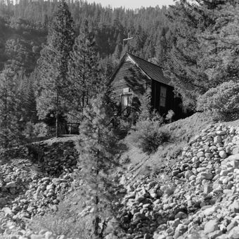 L'église catholique de Sawyers Bar se dresse dans la Forêt Nationale de Klamath, présentant des éléments architecturaux typiques des structures religieuses du XIXe siècle.