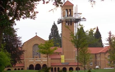 L'Abbaye Mount Angel occupe une butte de 148 mètres dans la vallée de Willamette, hébergeant une communauté de 51 moines bénédictins.