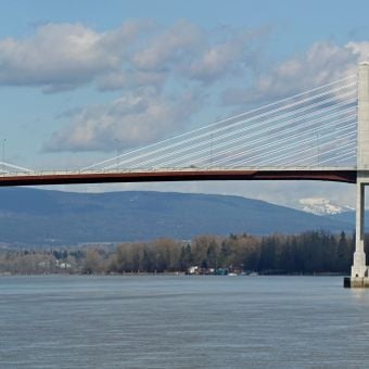 Le pont Golden Ears s'étend sur 955 mètres au-dessus du fleuve Fraser, reliant Surrey et Langley sur la rive sud à Maple Ridge et Pitt Meadows sur la rive nord.