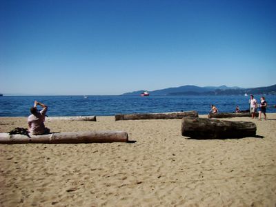 Third Beach s'étend le long du côté ouest de Stanley Park avec des troncs d'arbres dispersés sur le sable pour le repos des visiteurs.