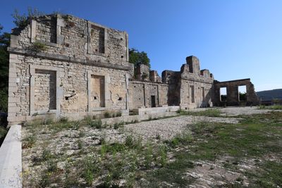 Les vestiges de l'Abbaye Saint-Vivant de Vergy comprennent des murs en pierre, des fondations d'église et des éléments architecturaux dispersés dans le paysage.