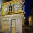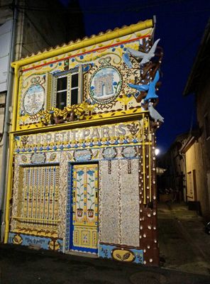 La maison du Petit-Paris présente une façade couverte de sculptures, de faïences colorées et de motifs floraux intégrant des miniatures de monuments parisiens.