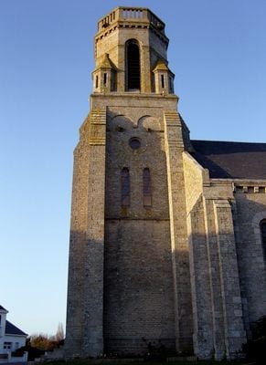 Le bâtiment en pierre blanche présente un clocher qui domine le quartier résidentiel proche de la côte atlantique de Loire-Atlantique.