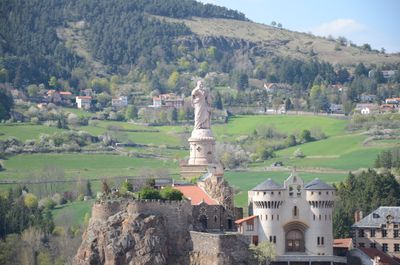 La basilique comprend deux tours crénelées et se dresse sur une fondation rocheuse surplombant la rivière Borne dans le département de la Haute-Loire.