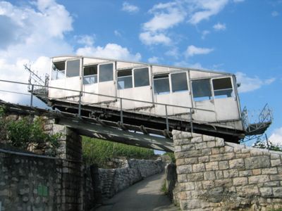 Le funiculaire Vinifuni relie le village viticole de Ligerz à Prêles par une montée raide surplombant le lac de Bienne et les vignobles environnants.