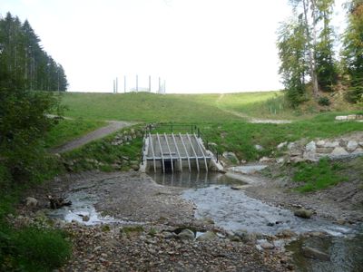 Le bassin de rétention Jonenbach comprend un barrage en terre de 163 mètres avec des structures pour la régulation des débits.