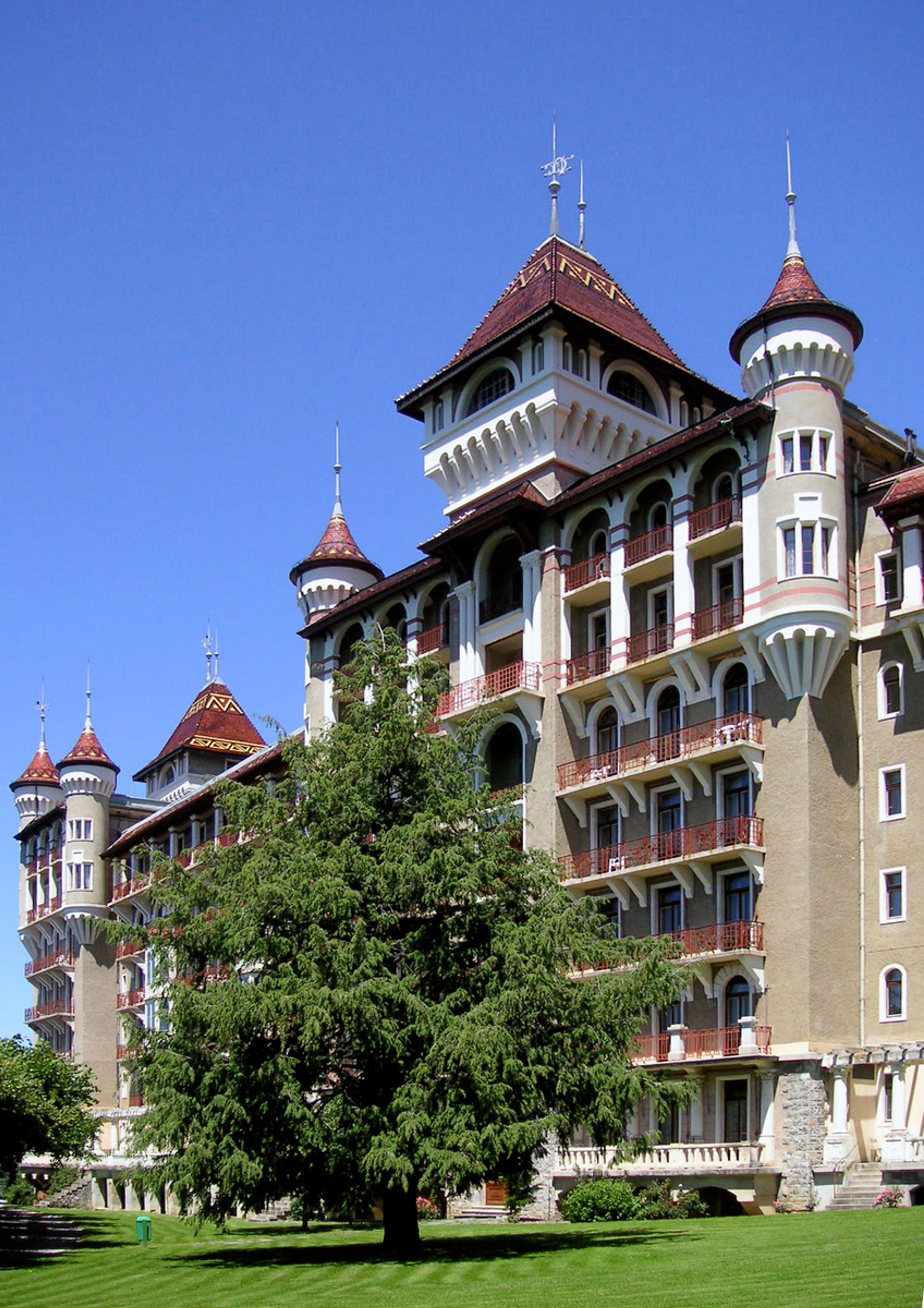 Le Caux Palace Hotel domine le Lac Léman à 1000 mètres d'altitude, présentant des tours et tourelles ornées de tuiles colorées sur sa terrasse de 400 mètres.