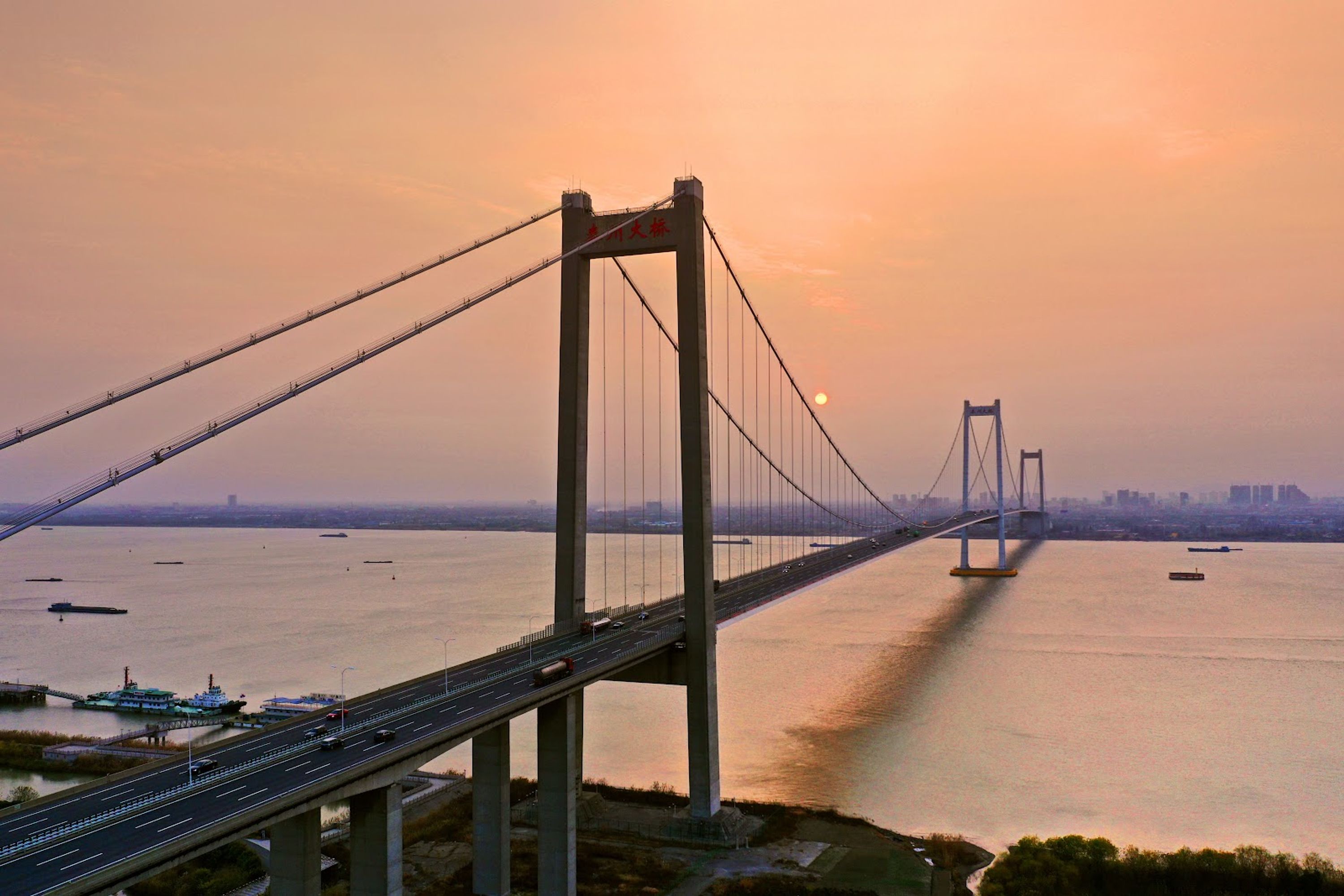 Le pont du fleuve Yangtsé à Taizhou s'étend sur plus de 62 kilomètres au-dessus du cours inférieur du fleuve, avec une section suspendue présentant deux travées principales de 1 080 mètres chacune et des travées à poutres-caissons au sud totalisant 2 905 mètres de longueur.