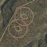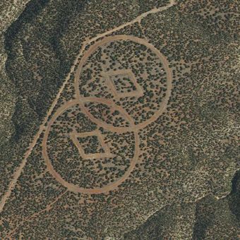 Le complexe affiche un grand symbole de surface visible d'en haut, composé de deux cercles qui s'entrecroisent avec des formes de diamants entre eux. Cette marque crée un élément visuel caractéristique qui façonne l'apparence du site de loin.