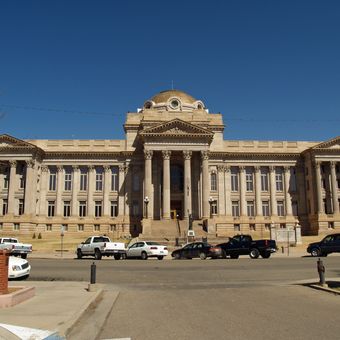 Le palais de justice du comté de Pueblo présente des murs en grès blanc avec des motifs d'appareillage et une structure centrale à double dôme.