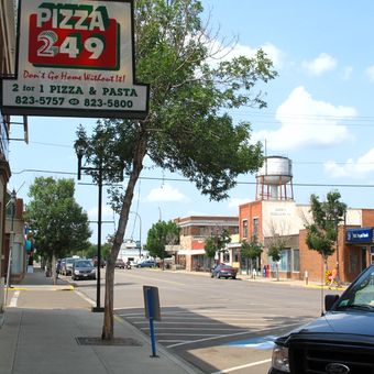 Drumheller est une localité située dans la vallée de la rivière Red Deer, entourée par les vastes paysages d'érosion des badlands de l'Alberta. Les rues longent la berge tandis que des collines de roche sédimentaire stratifiée s'élèvent tout autour, miroitant dans des tons gris, bruns et rouges.