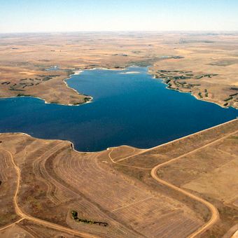 Le barrage de Bowman-Haley s'étend sur 1,746 mètres à travers la branche nord de la rivière Grand, créant un réservoir de 7 kilomètres carrés.