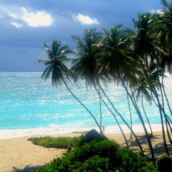 Bottom Bay est une large baie sur la côte sud de la Barbade, entourée de hautes falaises de corail qui s'élèvent abruptement de l'eau. La plage s'étend doucement avec du sable doré, tandis que les cocotiers poussent le long du rivage et l'eau scintille d'un bleu limpide.