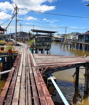 Kampong Ayer est un grand village aquatique construit entièrement sur pilotis au-dessus de la rivière Brunei, s'étendant sur environ 10 kilomètres carrés et relié par environ 38 kilomètres de passerelles en bois.