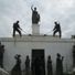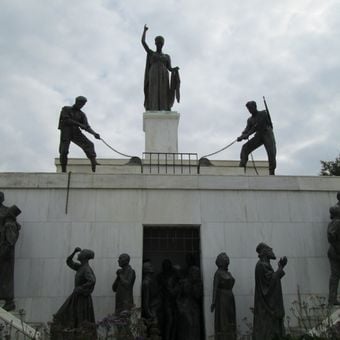 La composition sculpturale inclut des représentations détaillées de prisonniers, paysans et membres du clergé se libérant des contraintes coloniales.