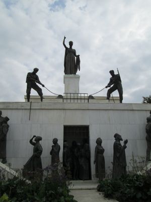 Le Monument de la Liberté présente des statues de combattants EOKA tirant des chaînes pour ouvrir des portes de prison, surmonté par la liberté.