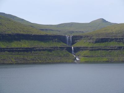 La cascade Fossá présente deux chutes distinctes descendant 140 mètres des hautes terres jusqu'au détroit de Sundini près du village de Haldarsvík.