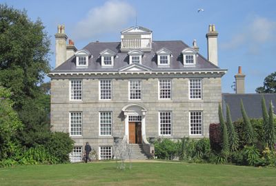 La façade en granit du manoir de Sausmarez réunit des éléments architecturaux des périodes Tudor, Queen Anne et victorienne dans une résidence historique.