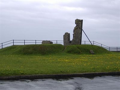 La colline présente des vestiges d'une salle de banquet du XVIIe siècle et se trouve près de la route côtière entre Castletown et Derbyhaven.