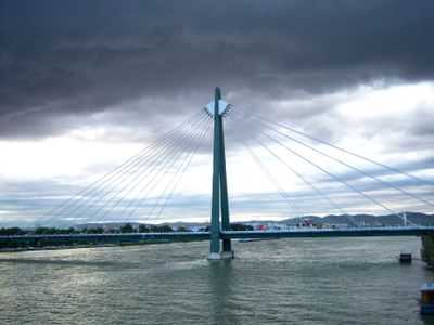 Le Danube City Bridge est un pont à haubans en acier qui traverse le Danube avec une largeur de 10 mètres. Il supporte les véhicules routiers, les voies de métro, les chemins piétonniers, les pistes cyclables et les installations techniques.
