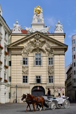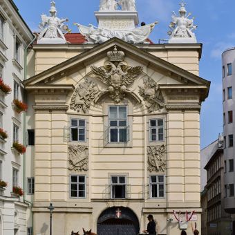Le Bürgerliches Zeughaus présente une façade baroque avec des décorations ornées, comprenant des figures allégoriques et un aigle bicéphale portant les armoiries de Vienne.