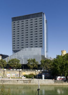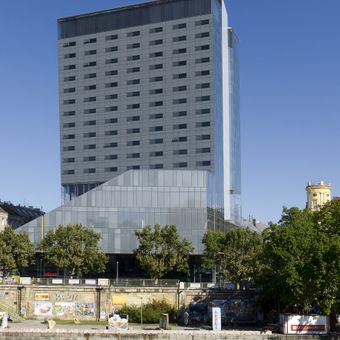 La Tour Uniqa Nouvel de 75 mètres comprend 182 chambres réparties sur 19 étages, avec des parois vitrées donnant sur le Canal du Danube.