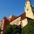 La structure de l'église présente une combinaison de briques, de grès et de béton, avec des tours jumelles et des vitraux colorés dans tout le bâtiment.