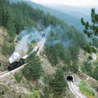 Le chemin de fer Šargan Eight traverse un terrain montagneux, gravissant 300 mètres avec des voies formant un huit.