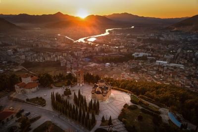 Une église orthodoxe se dresse sur une colline au-dessus de la ville et est accessible par un chemin de croix qui traverse des pins et des jardins de pierre. De là-haut, on domine la vallée de la rivière et les toits rouges qui s'étendent vers les montagnes proches.