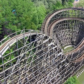 La structure en bois s'élève à 28 mètres sans inversions et utilise un mécanisme à chaîne pour hisser le train.