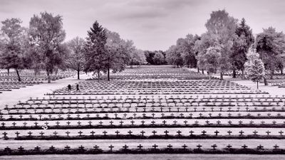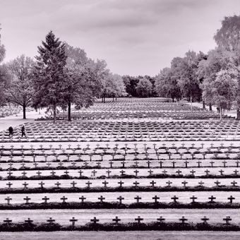 Le cimetière présente des rangées de croix uniformes en granit marquant les sépultures de 39,100 soldats allemands sur 6.5 hectares.