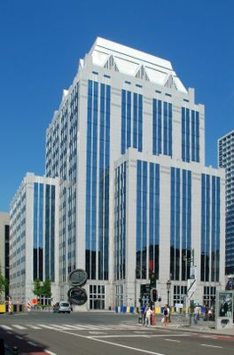 Le bâtiment, achevé en 1997, représente une collaboration entre l'atelier d'Architecture de Genval et ELD partnership pour créer un centre financier contemporain.