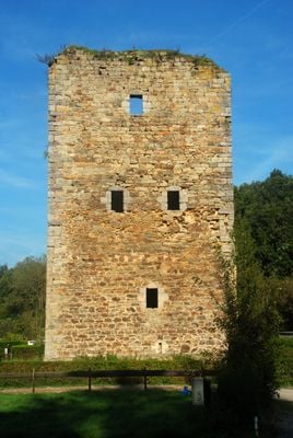 La Tour d'Alvaux s'élève comme une structure résidentielle en pierre à base carrée, entourée par les eaux de la rivière Orneau et des marécages.