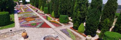 Le jardin botanique de Balchik s'étend sur les versants d'une colline surplombant la côte de la mer Noire, avec des collections réparties sur plusieurs terrasses en pente. Les plantes sont groupées par type et origine, dispersées sur le terrain en sections qui descendent le long de la pente.