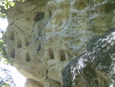 La formation rocheuse présente plus de 200 niches taillées réparties sur quatre blocs de pierre massifs séparés par des gorges naturelles profondes.