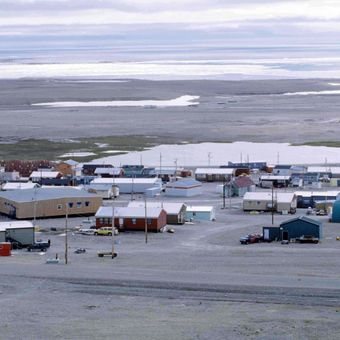 Resolute est une localité située sur l'île Cornwallis dans la région de Qikiqtaaluk, à environ 600 kilomètres du pôle Nord magnétique. Les maisons se dressent sur un terrain plat au bord de la côte, entourées de toundra nue et d'eau libre pendant le court été arctique.