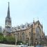 La Cathédrale Saint-Michel est un édifice religieux de style néogothique situé à Toronto, au Canada, construit en briques rouges massives. Le bâtiment présente des arcs pointus caractéristiques, des détails de pierre sculptée et une haute flèche qui s'élève au-dessus du paysage urbain environnant.