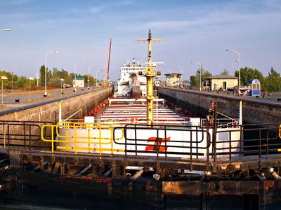 L'écluse de la Côte-Sainte-Catherine élève les navires de 9 mètres au-dessus du niveau de l'eau, permettant un passage sûr au-delà des rapides de Lachine.