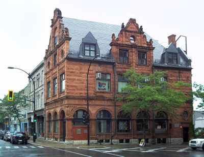 La structure en grès se dresse à l'intersection des rues Notre Dame Ouest et des Seigneurs, présentant des éléments architecturaux de style Queen Anne.