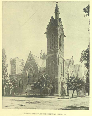 L'église St. James-Bond était un bâtiment situé sur l'avenue Road à Toronto, présentant des éléments caractéristiques du style Tudor Revival, tels que des toits à pignon très pentus, des motifs décoratifs d'ossature bois et de cheminées en brique bien visibles. La structure offrait de l'espace pour les services religieux et les activités communautaires.